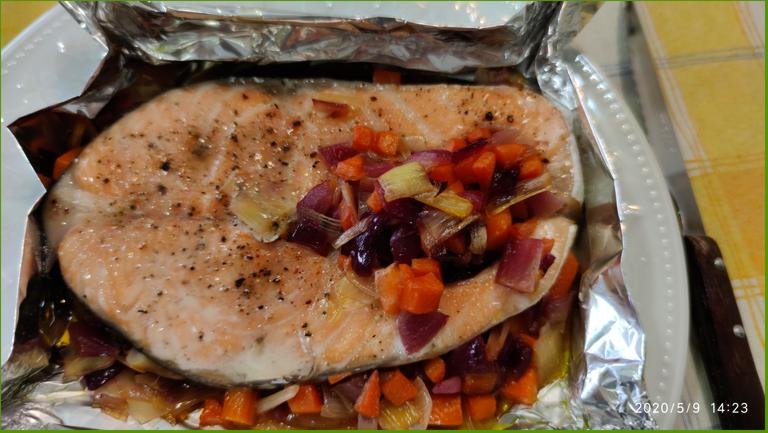 Por lo general el papillote es como un sobre cerrado que te permite cocinar con el jugo de los propios alimentos. Este papillote es tan rápido que no hace falta cerrarlo, además tiene la ventaja de que podemos ver el punto de cocción del salmón.