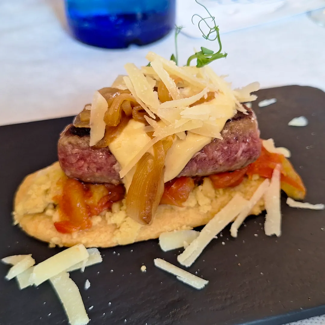 🍴 El siguiente plato fue también un clásico: el restoburger de Angus. El plato consiste en una base de coca de mollitas, lleva también tomate, cebolla caramelizada, una mini hamburguesa de Angus con una salsa que no sé cuál es. El resultado final es sencillamente magnífico, donde no solamente destaca el sabor estupendo de la carne, sino que además, al igual que sucede con el canelón, destaca el equilibrio de los sabores. Cada bocado de esa pequeña hamburguesa es sencillamente delicioso. Podrían venderla como helado y seria un top del verano 🌞 .