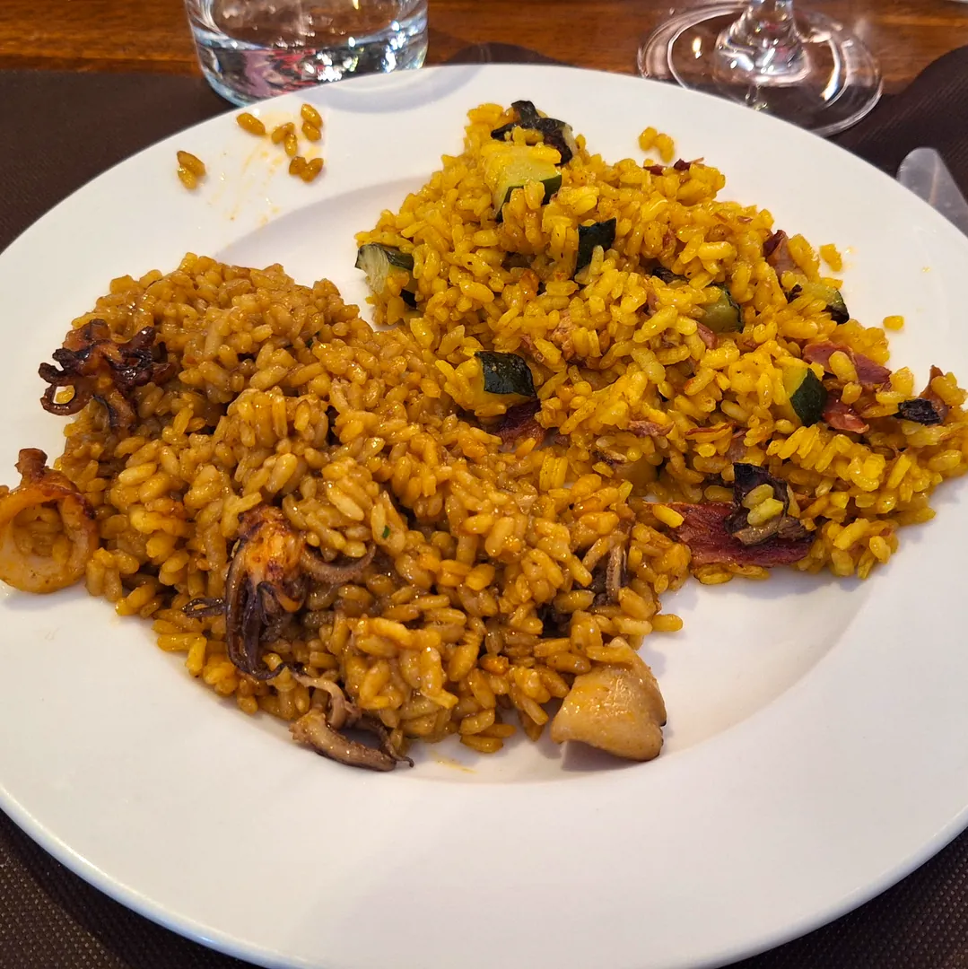 🍴 Llegaron dos arroces, uno de pato y otro a banda, ambos muy sabrosos, pero mi corazón (y mi estómago) se inclinaron hacia el arroz a banda en esta ocasión. Las raciones son más que correctas, nada de las minucias que sirven en otros sitios donde mientras comes estás pensando donde vas a merendar.